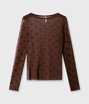 Slim fit transparante longsleeve top, gemaakt van mesh. Voorzien van een brede boothals, lange mouwen met duimsgaten en een raw edge zoom- en mouwafwerking
