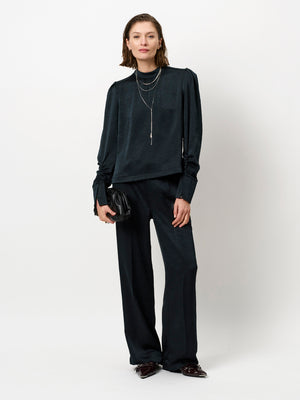 Onze Jules broek in Midnight Green is een tijdloze essential. Deze flatterende stijl is gemaakt van 100% gerecycled polyestersatijn met mechanische stretch. De subtiele kreukeffecten in de stof geven diepte en karakter aan je look. De broek heeft een hoge taille met plooien aan de voorkant en een elastische tailleband achter voor extra draagcomfort.