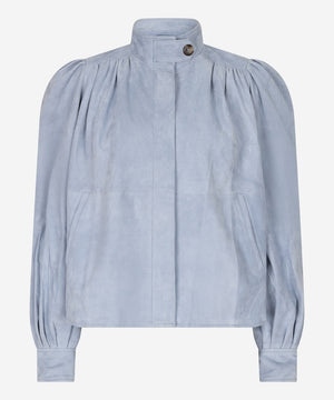 De Taimia top in Faded Blue is een elegante suède top met ronde opstaande hals en een vrouwelijke pofmouw. Dankzij de non-stretch kwaliteit en regular tot wijde pasvorm valt dit item soepel en comfortabel. De top heeft twee zijzakken en sluit met onzichtbare knopen, waardoor je de Taimia ook open kunt dragen als jasje.